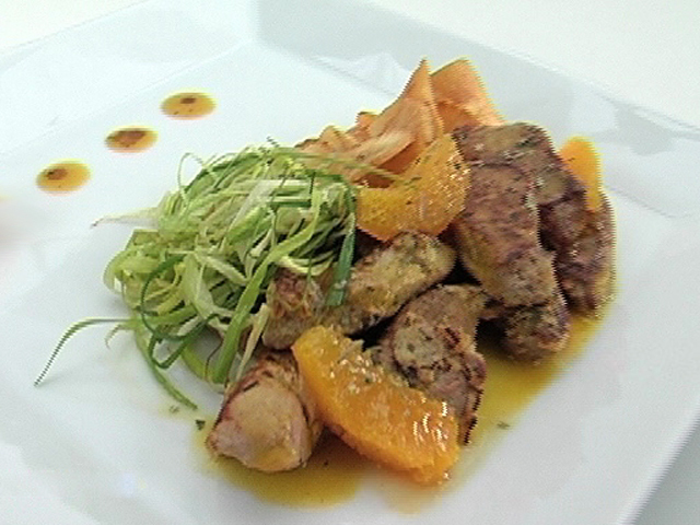 Нежная свинина в сочетании с хрустящей юккой.Состав:юкка — 1/2 штуки;апельсин — 1 штука;сок половины апельсина;орегано — 1 столовая ложка;соевый соус — 1 столовая ложка;кукурузная мука — 1 столовая ложка;сахар — 1 столовая ложка;яйцо — 1 штука;лук порей — 1/2 стебля;свинина — 130 гр;растительное масло по вкусу.